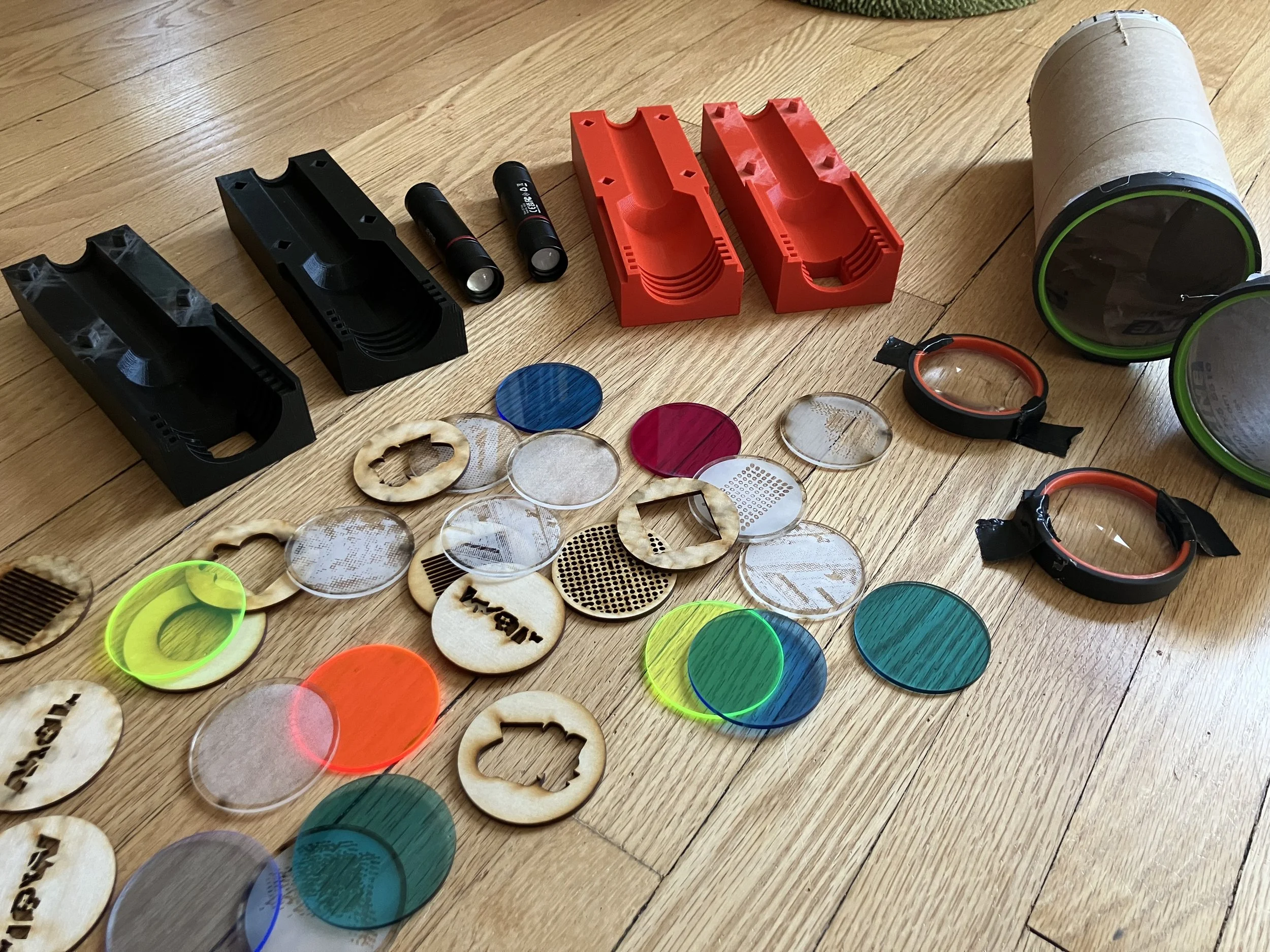 This project started by combining halftone patterns, colors and type digitally. As I began to feel limited by the software (and/or my ability to use it), I set out to recreate these combinations manually, in analog. I eventually arrived at a fun, modular set of 3d printed projectors and DIY lenses that allow for infinite combinations of type and image.